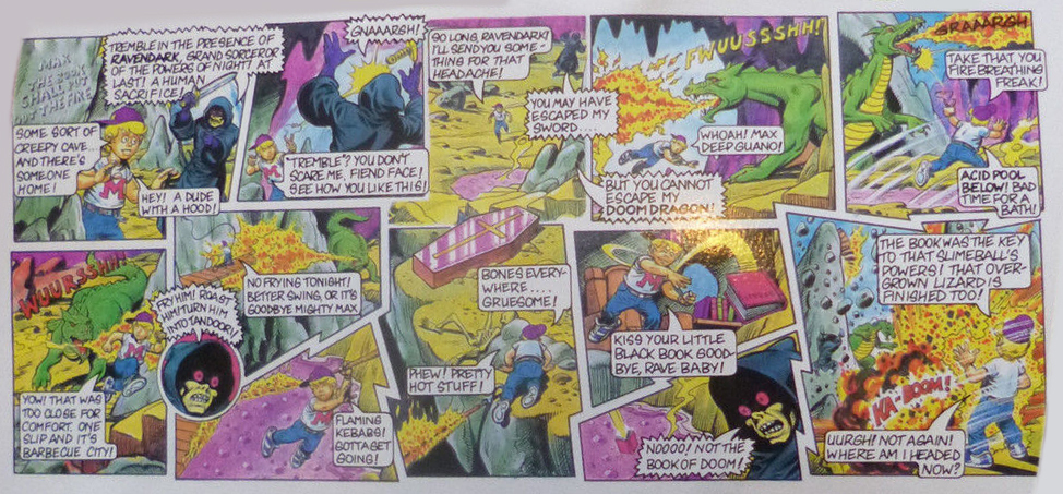 * The Doom Dragon opens up like most of the Doom Zone sets so that the top of the head is the back wall of the set and the bottom is the base of the set. The set stays up quite well on its own, opening to reveal the caverns of the evil wizard Ravendark. There was a minicomic on the back of the set that showed off all the features of the playset and set the scene for Max's adventures here.